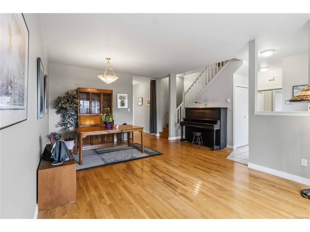 This townhouse spans over 2,150sf of living space on 2 levels with 3 spacious bedrooms, 2.5 bathrooms PLUS GARAGE! This awesome floor plan has plenty of bonus storage and expansive rooms that make it feel more like a house. The largest unit in this well run complex, situated in a quiet setting while being ideally located close to great schools, UVic, shopping and transit! PRIMARY BEDROOM SUITE ON MAIN FLOOR is large! has large walk-in closet and ensuite. Downstairs features 9' ceilings, 2 pc powder room, laundry room w/ garage access. Attractive living room with bay window, spacious dining room & large kitchen. Family room off kitchen has feature gas fireplace and glass sliders to a pretty patio area with charming hedges and established perennial landscaping. Upstairs has 2 Bedrooms, large landing/office area, vaulted ceilings, storage room & bathroom with skylight. Buyer to verify measurements/floor plan if important. Floor Plans, 3D Tour, Videos all online!